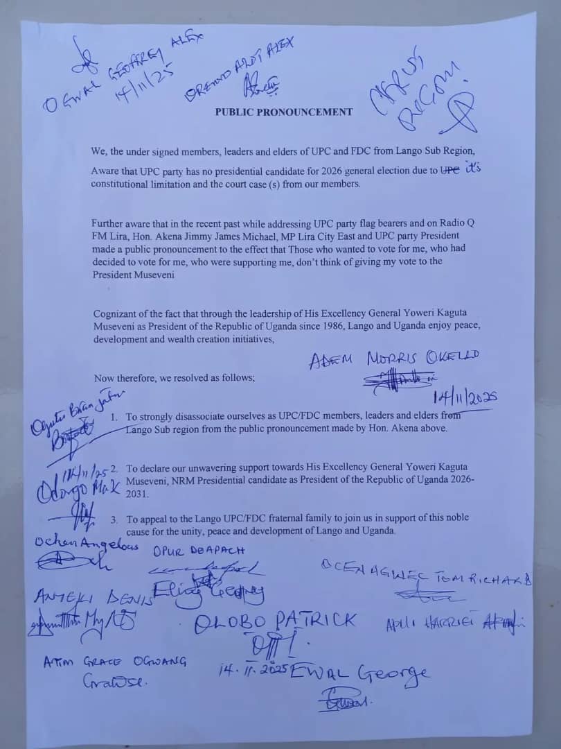 LIRA, UGANDA – In a significant political development, a faction of leaders and elders from the Uganda Peoples Congress (UPC) and the Forum for Democratic Change (FDC) in the Lango Sub-region have publicly broken ranks with UPC President Jimmy Akena and declared their unwavering support for President Yoweri Museveni in the 2026 general elections.